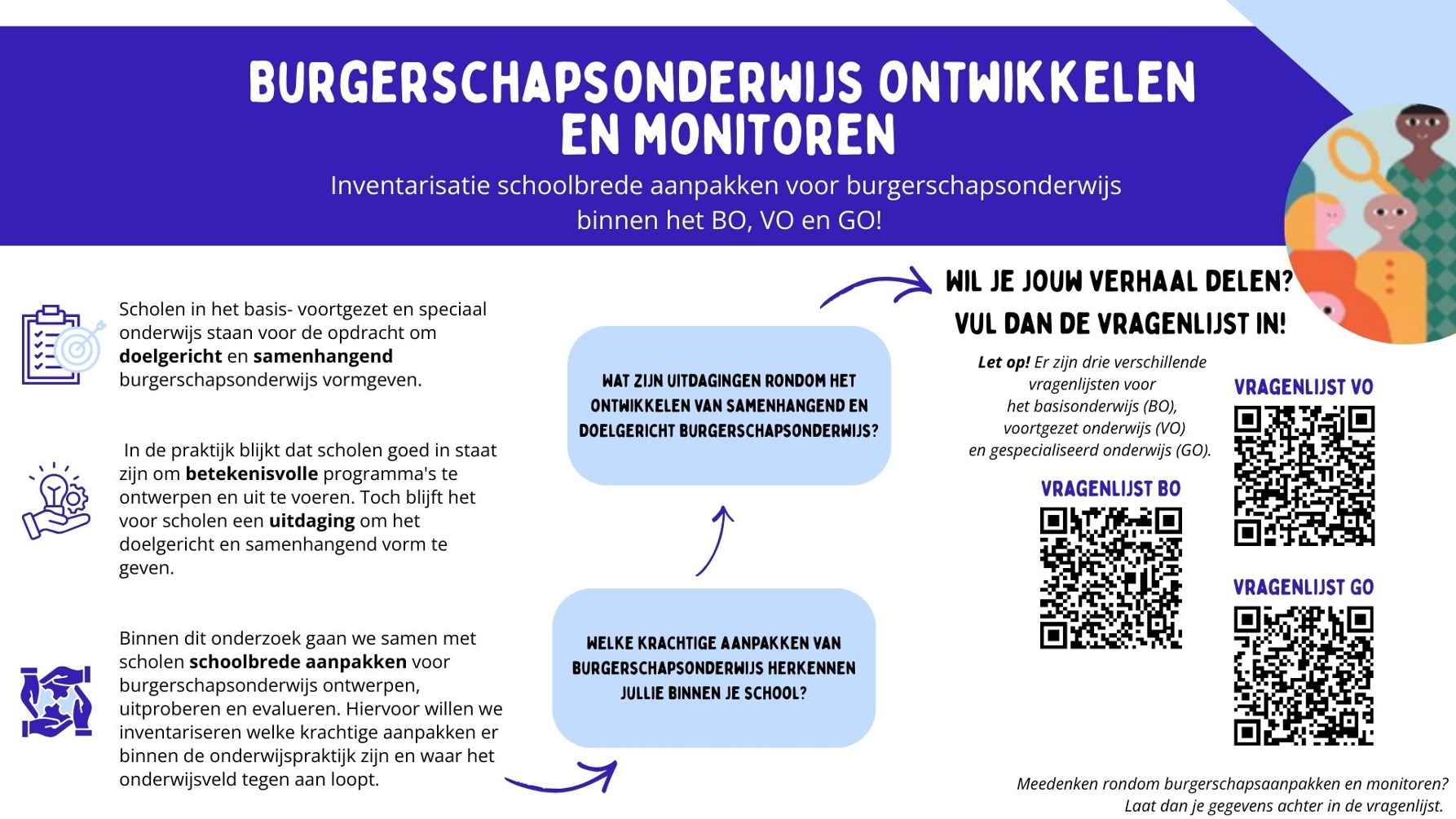 Het doel van het onderzoek is om impactvolle schoolbrede aanpakken van burgerschapsonderwijs en monitoring te ontwikkelen voor het basisonderwijs, voortgezet onderwijs en gespecialiseerd onderwijs.